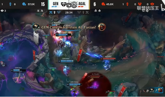 更扎心的是,AL的上野被GEN.G按在地上摩擦:Flandre除首局兰博外,后续对线被Kiin全面压制,仿佛在玩“单机游戏”;Tarzan的节奏被GEN.G野区压制,决胜局关键资源争夺中屡屡失利,粉丝直呼:“这打野是在逛街吗?”。