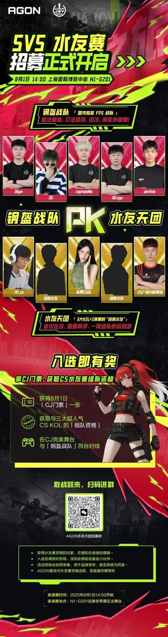 AGON爱攻面向全网所有热血CS玩家,招募2名天选之子,与3位完美世界电竞官方公会主播组队,一同对抗传奇钢盔战队(战队会有操作限制),为现场观众带来一场激燃热血的水友表演赛。敢不敢在现场和“传奇钢盔”碰一碰?这可能是你离职业大神最近的一次!证明自己实力的时刻到了!