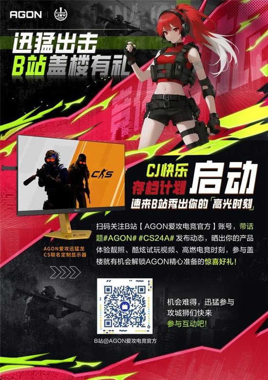 N1-G201完美世界展区现场参与“AGON爱攻迅猛出击·B站盖楼有礼”活动,关注B站【AGON爱攻电竞官方】账号,带话题#AGON#、#CS24A#发动态,晒产品体验靓照、酷炫试玩视频、高燃电竞时刻…… AGON专属线上好礼等你来拿。