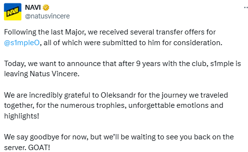 “在上届Major之后,我们收到了几份转会报价,” 他们的公告开头写道。“我们无比感谢他与我们共同走过的旅程,感谢那无数的奖杯、难忘的情感和精彩瞬间。”