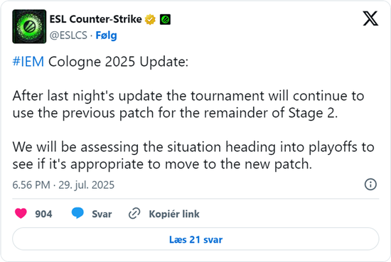 ESL已在社交平台确认,这项新更新不会在周二进行的小组赛最后几场比赛中生效。
