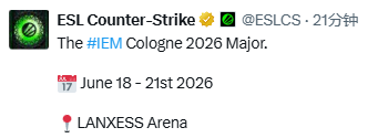 ESL宣布将在德国科隆举办2026年的首届Major,比赛定于6月2日至21日举行。