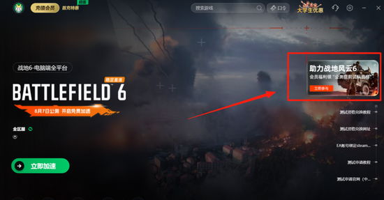 加速完成之后,就可以点击迅游加速器免费送【战地6】测试资格的活动了。