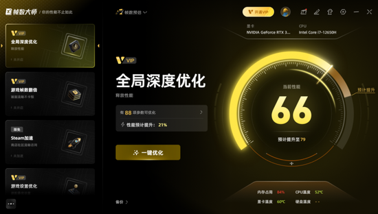 【帧数大师】能够一键全局优化,释放电脑性能,提升电脑帧数。让大家在游戏中再也不遇到掉帧、卡帧的问题。