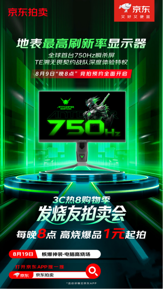 当电竞显示器行业还在为360Hz、500Hz刷新率激烈竞争时,蚂蚁电竞以一记“技术重锤”打破僵局。近期,惠科旗下高端电竞品牌蚂蚁电竞,其全球首款原生750Hz刷新率显示器ANT257PF在京东平台悄然上线,并宣布将于8月19日晚8点在京东拍卖频道以“1元起拍”形式开启拍卖,引发业界高度关注。这款定价7999元的“性能怪兽”,不仅刷新了量产显示器刷新率的世界纪录,更以0.8ms极速响应及电竞专属优化功能,重新定义了电竞装备的极限边界。