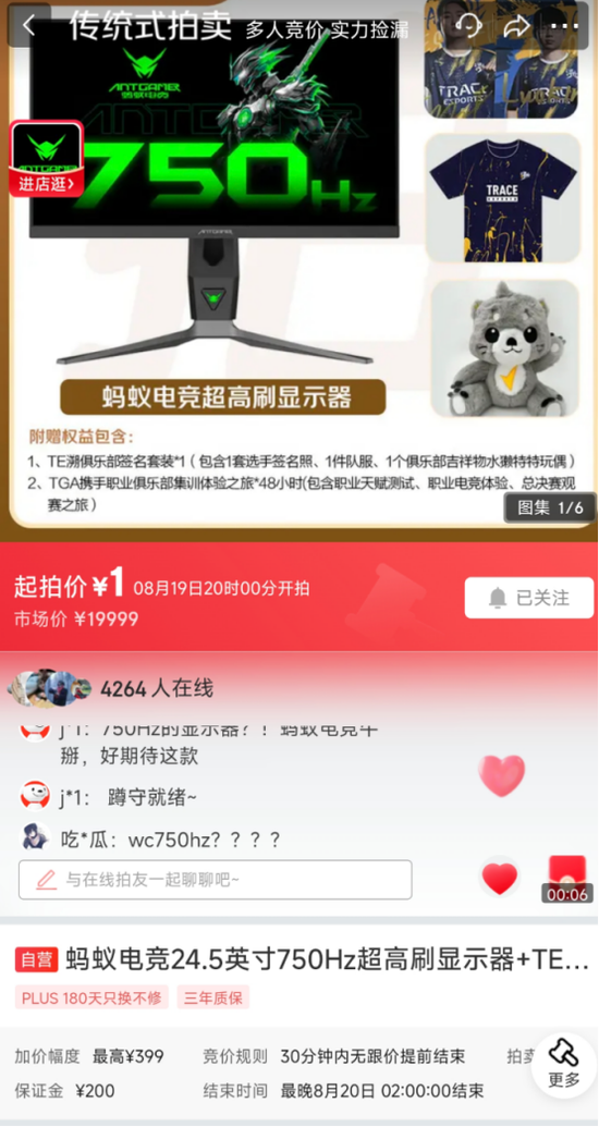 值得一提的是在本次京东拍卖活动,蚂蚁电竞宣布为最终拍到ANT257PF的用户提供特别的附赠权益,其中包含TE溯俱乐部签名套装以及TGA携手职业俱乐部集训体验之旅(48小时)等深度体验特权,可谓是诚意满满。