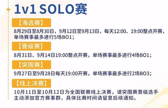 海选赛:8月29日至8月30日,9月12日至9月13日,每天12:00、19:00整点开赛,单场赛事最多进行5场Bo1。