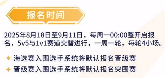 每周一00:00整,报名通道准时开启,5V5与1V1赛道交替进行,一周一轮,每轮4小场。各位召唤师们记得定好闹钟,准时报名,抢占先机!