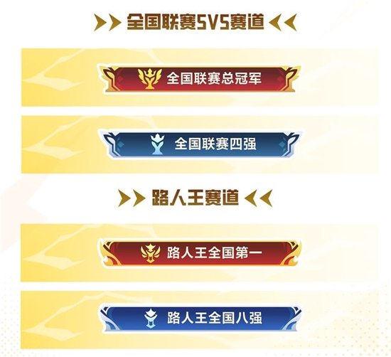 除了现金奖励外,比赛选手还将获得限时荣誉称号。5V5赛道的全国联赛总冠军、全国联赛四强,以及1V1赛道的路人王全国第一、路人王全国八强都将拥有专属的荣耀称号。