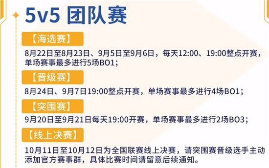 海选赛:8月22日至8月23日、9月5日至9月6日,每天12:00、19:00整点开赛,单场赛事最多进行5场Bo1。