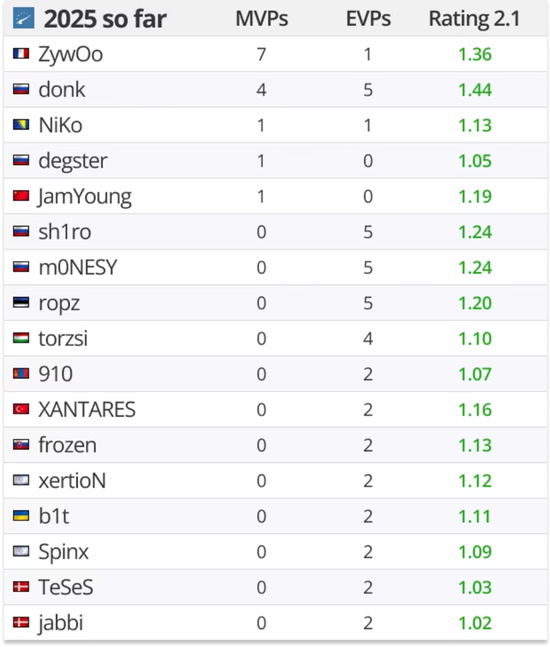 尽管他在CT方表现统治级(Rating 1.73),却在T方状态挣扎(Rating 0.97),但凭借稳定性与高输出,ZywOo仍成功当选EVP,这是他2025年首次获此荣誉,此前他已斩获7座MVP奖杯。
