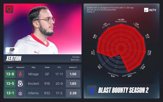 由于MOUZ的击杀数据由多名选手分担,xertioN以往往往需付出更多努力才能获得EVP,但本次赛事中,他凭借出色表现“轻松达标”。