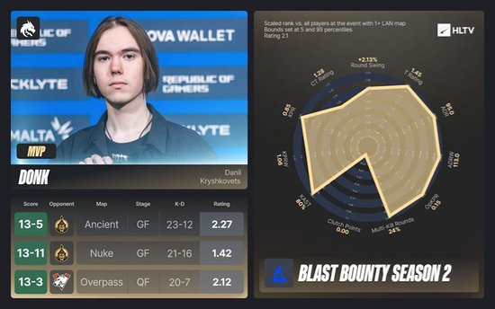 即便如此,donk的表现仍足够出色,他在线下总决赛中以1.40的Rating收官,斩获个人本年度第四座MVP奖杯。