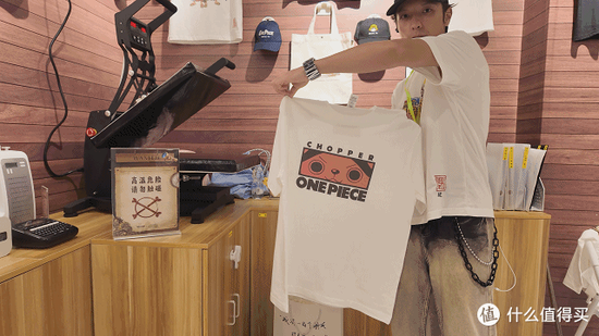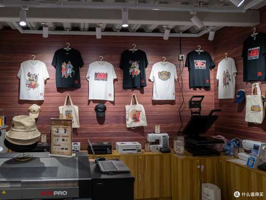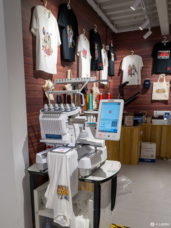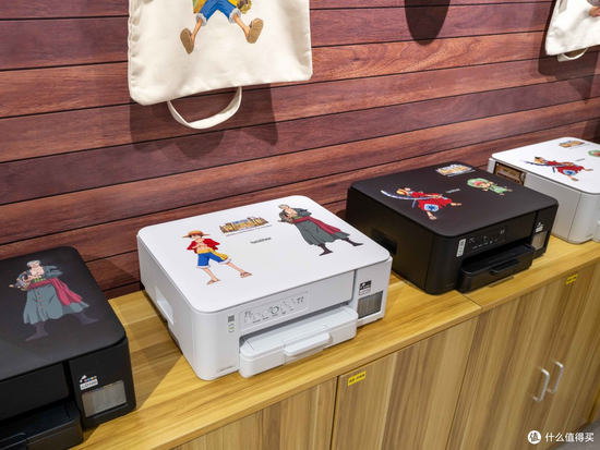 兄弟打印机展位的墙面像是船舱的内壁,仿佛走进了一艘海盗船内部。他们最新打印技术制作的T恤、环保袋和刺绣帽子,每一件都印着精美的海贼王图案。周边的柜台上则是一系列明星产品。