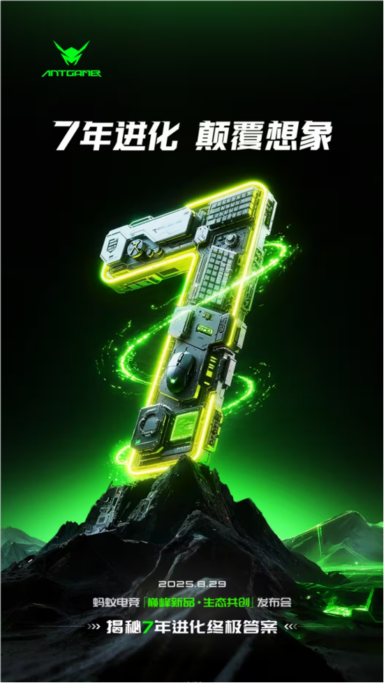 第二张海报则聚焦品牌发展历程,以“7年进化 颠覆想象”为核心标语,强调蚂蚁电竞七年来的产品迭代与技术积累,承诺将在发布会上“揭秘7年进化终极答案”。这显示出蚂蚁电竞此次发布不仅是一次新品亮相,更是对品牌七年成长的一次系统性总结与展望。