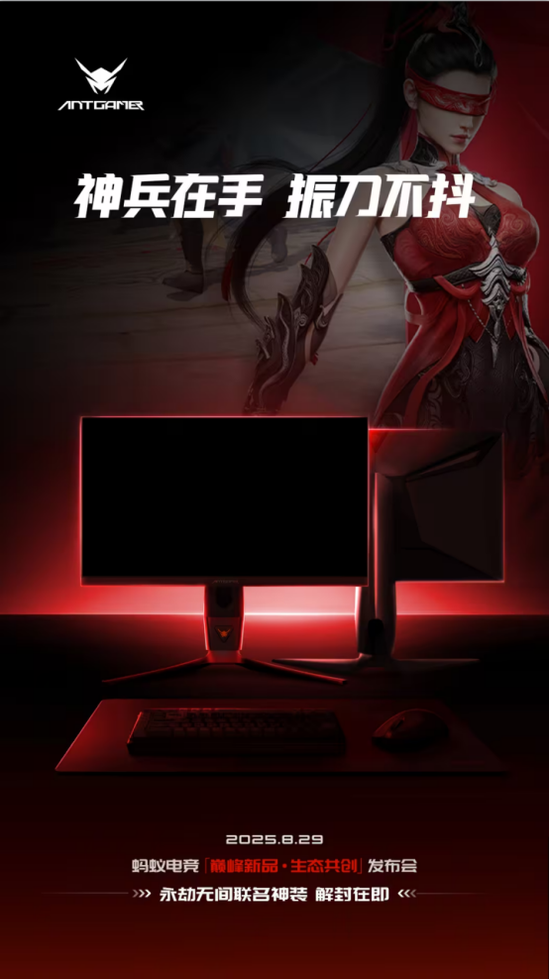 近日,国内知名电竞装备品牌蚂蚁电竞正式发布两款主题海报,宣布将于8月29日举办「巅峰新品·生态共创」大型发布会,致敬品牌成立七周年,并曝光与热门游戏《永劫无间》的联名合作计划,引发行业与玩家广泛关注。