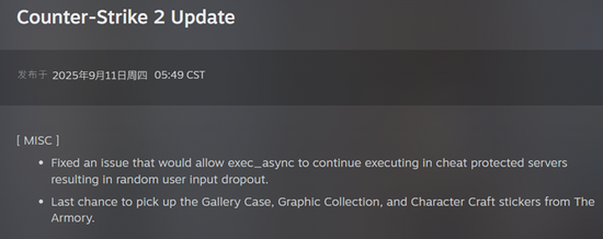 修复了一个问题:该问题导致exec_async指令在防作弊服务器中仍能继续执行,从而引发用户输入随机失效的情况。