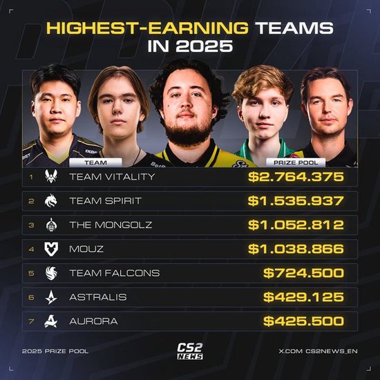 虽然在BLAST 伦敦公开赛线下总决赛中屈居亚军,但凭借上半年的辉煌战绩,Vitality战队依旧在2025年奖金榜中位居首位。根据外媒统计,他们目前拿到了2,764,375美元的奖金,比第二名Spirit高120多万美元。