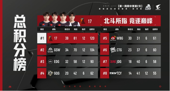 第一天结束后,GSW拿下榜首,随后是JDG和CTG,来自NVGR WIND拿到了战神榜榜首。