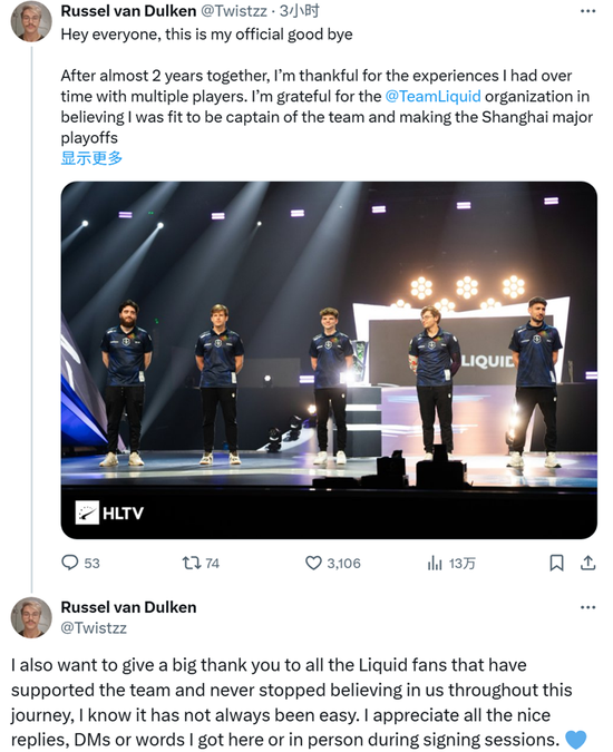 Twistzz在社交平台上发布动态,正式告别Liquid战队。