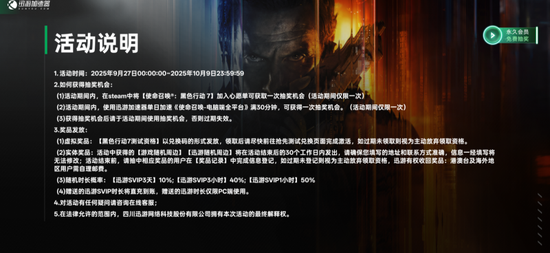 接着下滑找到【加速赢好礼】活动,只需玩家使用迅游加速器对【使命召唤系列任意游戏】加速30分钟即可获取本次机会