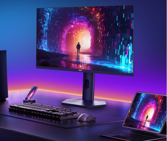 在外观设计上,GS27QKS延续了HKC天启系列一贯的简约与科技感。其采用三面窄边框设计,最大限度地提升了屏占比,带来更具沉浸感的视觉效果。背面加入了RGB电竞氛围灯效,支持多种灯光模式和亮度调节,为玩家的桌面增添一抹炫酷的色彩。显示器支架支持上下升降、前倾后仰、左右旋转以及90度垂直旋转,用户可以根据自己的使用习惯和桌面空间进行灵活调整,找到最舒适的观看角度。