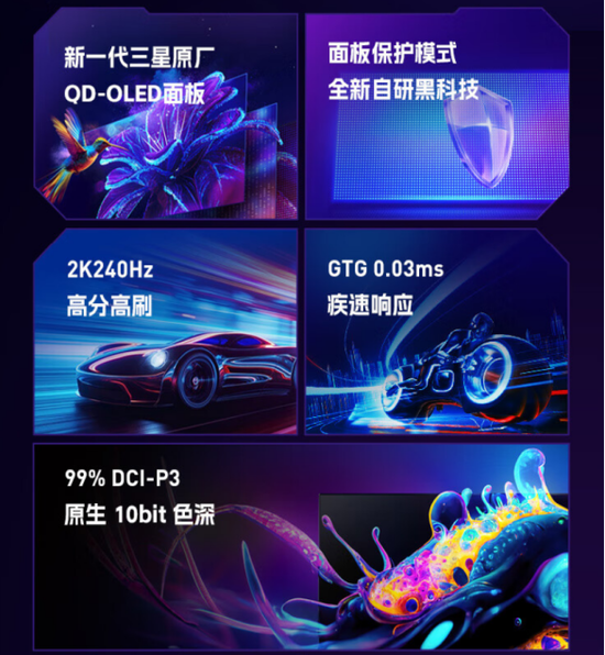 HKC GS27QKS的核心亮点在于其采用的新一代三星原厂QD-OLED面板。QD-OLED技术是OLED技术的进一步演进,它结合了量子点的宽色域优势和OLED自发光的特性,能够呈现出更加鲜艳、生动的色彩和更深邃的黑色。GS27QKS支持99% DCI-P3、 99%Adobe RGB广色域和原生10bit色深,色准小于2,出厂逐台校准,确保了色彩的准确性和过渡的平滑性,无论是专业的图像处理、视频剪辑,还是游玩大型3A游戏,这款显示器都能提供出色的色彩还原能力。GS27QES还搭载了全新冰甲散热1.0系统,石墨烯+全装散热凃层+定制散热器件,保护每个OLED像素在舒适温度下工作运行,提高屏幕使用寿命。