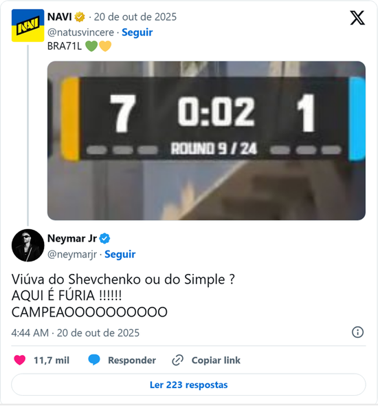 在FURIA以3-2击败Natus Vincere赢得TP世锦赛冠军后,身为桑托斯球员且是FURIA粉丝的内马尔在社交平台上发布了一些帖子,嘲讽NAVI并庆祝FURIA夺冠。