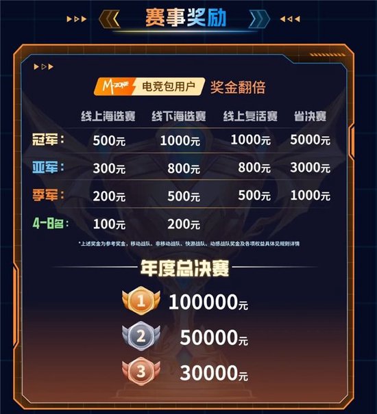 本次赛事由中国移动主办,咪咕公司全程IP运营。为激励优秀青年电竞人才,大赛特设极为丰厚的奖励机制,累计总奖金超20万元。其中年度总决赛奖金冠军10万元、亚军5万元、季军3万元;而本场线下赛的活动现场,也将配有丰厚的现金奖励:冠军500元、亚军300元、季军200元,第4~8名的队伍也会获得100元的奖金鼓励。同时,队伍中若有超过三名小伙伴是电竞包用户,则获奖队伍可享受奖金翻倍权益。