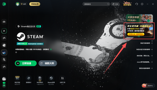 首先我们打开迅游加速器,点击右侧的【学生党专属·可暂停天卡】进入活动页面