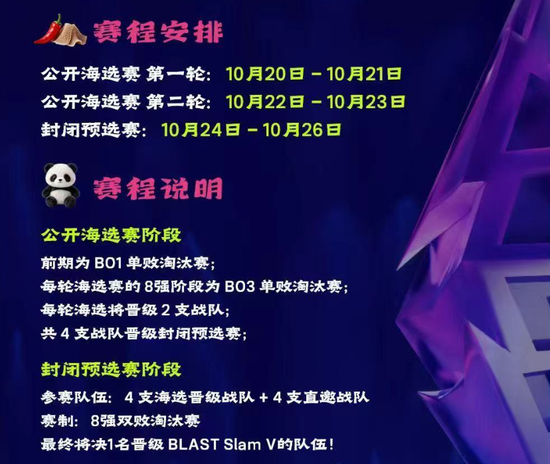 BLAST Slam V中国区预选赛分为公开海选赛和封闭预选赛两个赛段。公开海选赛共分两轮,每轮赛事均采用相同规则:前期为BO1单败淘汰制,进入8强后则转为BO3单败淘汰制;每轮将决出2支优胜战队晋级,两轮共计4支战队晋级下一轮。海他们将与4支直邀战队会师封闭预选赛,封闭预选赛采用8强双败淘汰赛制,最终决出一支冠军队伍,携手“主场英雄战队”XG一起代表中国赛区参加在成都举行的正赛。