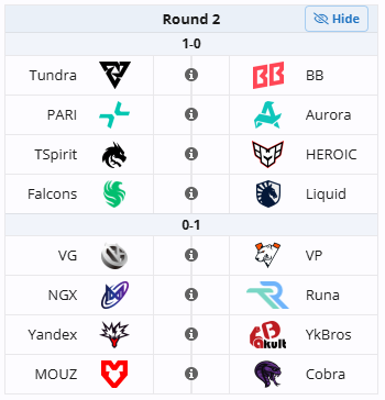 裂变天地S2瑞士轮首日结束,YB 1-2不敌Heroic,VG 1-2不敌Tundra,两支战队跌入0-1组。