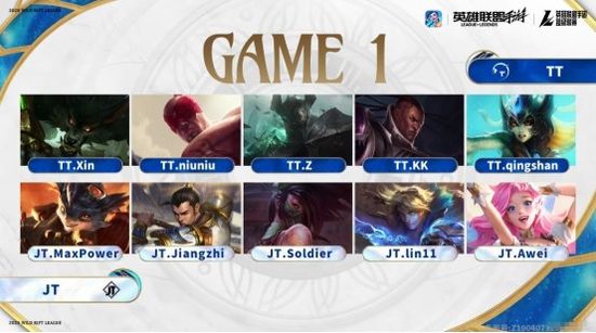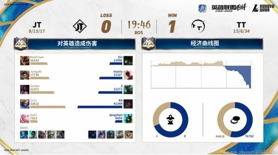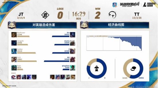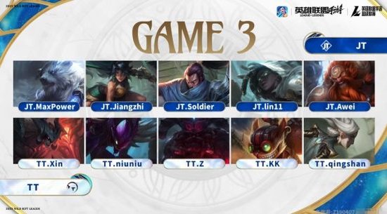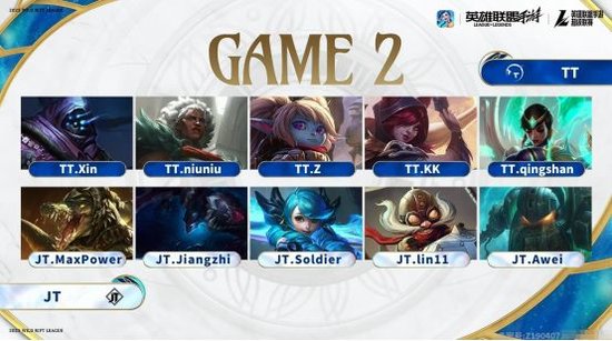 或许是因为第一局比赛JT在双人路拿到优势,在第二局比赛开始没多久,JT再次针对TT下路。不过这一局,TT明显是有所防备,中路与上路都来支援下路。在这样的情况下,JT前期反倒是因为这个抉择而陷入了劣势。掌握场上主动权的TT又开始率先抱团,更是在很短的时间内,凭借着出色的抓机会能力与团战能力,TT巩固了自己前期的优势。并且在比赛时间来到15分钟左右的时候,TT已经拥有了一万左右的经济优势。随后,与第一局类似,手握巨大优势的TT并没有给JT太多机会,一直抱团推进,最终TT再次顺利拿下比赛,手握赛点。