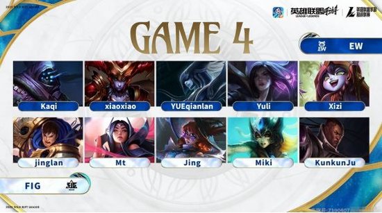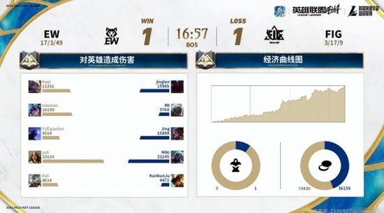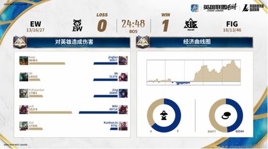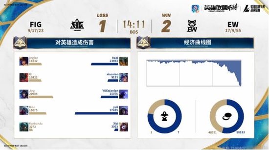 因为上局比赛努努打野非常有效果,这局比赛EW再次掏出了努努打野。而在比赛刚开始不久,努努便再次有所发挥,成功帮助双人路在下路打出了一波1-2的越塔团战。虽然EW再次在前期取得优势,但FIG这局比赛的决策明显要比上局比赛好很多。“人头”与经济一直死咬着不放。这局比赛的转折点是在比赛时间12分钟的时候,FIG选择中路推进,但很明显EW的防守与团战更加出色。不仅成功打出了一波1换4漂亮团战,更是因此拿下了关键的大龙。拿下大龙后,场上局势瞬间扭转。凭借着大龙Buff加持,EW顺利扩大经济。最后更是凭借着经济与团战的出色表现,一波带走了FIG,拿下了这局比赛的同时并获得了赛点。