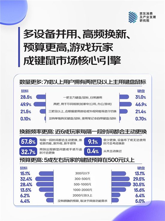 游戏玩家为键鼠主力消费人群,他们“设备更多” “换新更高频””预算更高”。 调研显示,7成以上用户拥有两把及以上主用键盘鼠标,近6成游戏玩家表示“每隔一段时间都会主动更换,体验新功能、新外观、新手感“,近5成玩家的键鼠预算集中在500元以上中高端价位。