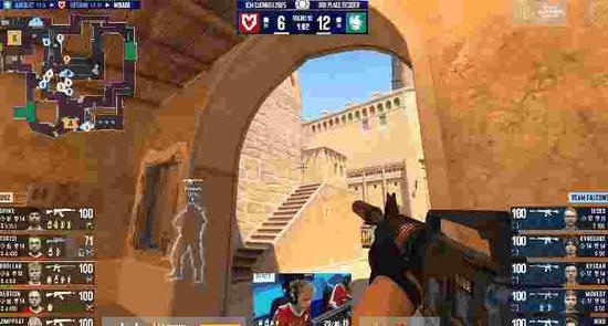 来到图一,上半场的猎鹰先作进攻方开局,双方开局中路交火,CT前顶对枪m0NESY拿到双杀,随后T直接进A区下包拿下手枪局。