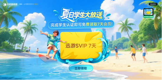 想要参与本次迅游加速器的学生卡活动,就先要打开客户端,点击右侧的【学生党专属·可暂停天卡】进入活动页面