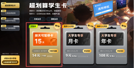 进入页面后我们就会发现【特权1:超划算学生卡】中有三种套餐,分别是按天可暂停卡、大学生专享月卡和大学生专享年卡,大家进行【大学生认证】后可以根据自身需要选择合适的套餐