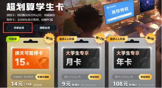 【大学生专享月卡】和【大学生专享年卡】属于拼团卡,玩家们可以和自己的朋友一起购买这类套餐,只需要购买之后【共享会员】即可,算下来拼团购买低至9元/月,想想是不是特别划算呢?