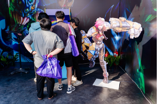 在赛场外的互动区,与英雄联盟的吉祥物合影打卡成为了众多粉丝的首选项目。