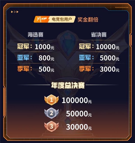 本次赛事冠军战队不仅将赢得10000元现金奖金,更将手握唯一一张通往全国总决赛的门票,代表辽宁出征更高舞台;亚军、季军分别获得5000元和3000元奖励。特别值得一提的是,动感地带电竞包用户享受奖金翻倍权益,让实力获得加倍回馈。