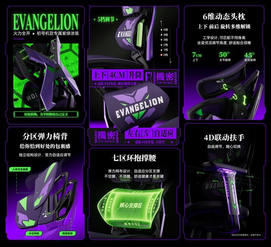 椅身延续了EVA初号机经典紫绿色系,并加入了骁骑标志性“X”可拆换背甲,重构世纪美学物语。C型动态腰枕,工学设计,七区舒适撑腰,5档调节,上下4cm升降,左右5°自适应。六维动态头枕,上下7cm调节,50°关节旋转,45°前后旋转,解锁腰颈一体支撑作战体验。分区弹力椅背,人体仿生曲面设计,受力自适应「分压」调节,无论坐姿如何调整,全程贴合。4D联动扶手,追随支撑,可前后调节,后仰联动,端游/手游/休憩等多场景支撑,手臂不悬空,激战操控自如。此外,椅身采用紫晶特网,以刺绣方式雕琢EVA专属图案,高回弹、抑菌不闷汗,清爽舒坐火力全开。