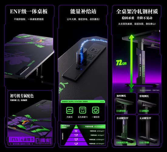 EVA联名款电竞桌,同样在酷炫黑的底色上延续了EVA初号机经典紫绿色系,桌面以压贴工艺印制初号机形象,耐磨防刮。桌面采用ENF级一体成型桌板,至高标准环保等级,加厚强抗压,轻松放置电竞设备、生活用品、珍藏手办。桌面嵌入式插排设计,配以“电源接入”字样,简洁布局便捷充能,“作战开始”。加厚冷轧钢桌架,上下72cm稳固升降;采用初号机机甲编码设计的桌腿,也能降低震荡,无论战况再怎么激烈,都可稳锁胜局。