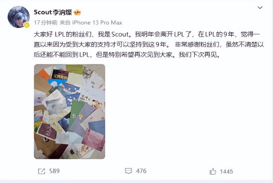 近日LPL老将“Scout”李汭燦选手在他的微博账号上发文表示自己将离开LPL并且感谢粉丝,这位选手由于其在几年前的精彩发挥被一些玩家尊称为“三圣一帝”中的“学圣”,但是近些年的发挥有一些状态上的波动,引起了粉丝群体的不满,而在今年这位选手将会回到LCK。