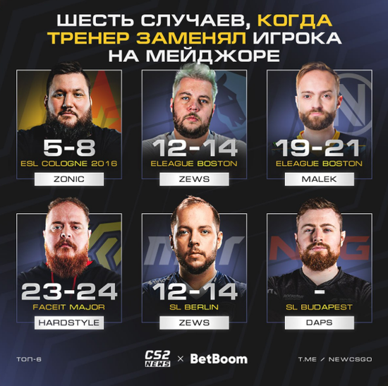 在Valve主办的Major赛事历史中,此前已有五位教练因特殊情况临危受命,替补选手登场参赛,而美国教练daps将成为第六人。以下为历史上五起教练替补出战的案例回顾。