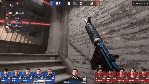 换边再战,第13回合,NIP爆弹打A遇到LVG四内场开局,xKacpersky突破两人后包点的C4LLM3SU3利用双向掩体反接NIP三个人头,B点赶来的EmiliaQAQ也收下xKacpersky,但Snappi面对一打三残局中没有手软,先收下了想对枪的EmiliaQAQ,又快速换位到包点修脚打死C4LLM3SU3,和z4kr的斗牛也笑到了最后。 第14回合,lvg强起,开局外场选择放守,想通过人数优势在红楼梯和B同时前压不料扑了个空,此时土匪已经在A点展开,面对多重枪线以及枪械劣势只能眼看对手拿到赛点。 第15回合,LVG继续强起,Westmelon和starry前压车头换掉两人,5点5道烟里的C4LLM3SU3找机会也钻烟换掉车头一人,EmiliaQAQ在红楼梯的沙鹰也成功对位sjuush,最后NIP仅剩的r1nkle面对z4kr的鸟狙被击中一枪后没给出开第二枪的机会,此时EmiliaQAQ换位来到匪口,不巧的是r1nkle有所警觉一直架住匪口收下EmiliaQAQ。