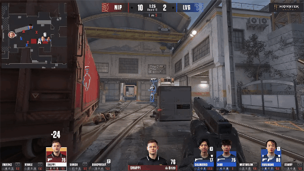 火车,NIP选CT开 手枪局LVG匪楼集合爆弹打B,但NIP见到A区毫无动静已经提前回到3B,面对三重交叉进入包点举步维艰,让高台的r1nkle拿下4杀。 第3回合,开局绿通的Westmelon先拿r1nkle人头,但后续CT的红楼梯摆铺直接拿下EmiliaQAQ和Starry,丢失红楼梯图权的三叶和阿花想去b双双白给 第四回合,开局C4LLM3SU3收下低坡前压的Snappi,sjuush和r1nkle守b后点收下三名T 第五回合,C4LLM3SU3和EmiliaQAQ出匪口双双突破成功,一颗包点火成功清空包点,三叶混死警家拿下胜利 第6回合,开局Starry抢出匪口吃到三颗炸雷直接白给,后续身位的土匪遇到奥拉夫和车尾的交叉火力被全部化解, 第7回合,LVG快抢红楼梯夹A,r1nkle接住一人后光速被补,EmiliaQAQ从匪口杀出直接配合包点火直接清空A区 第8回合,LVG集合进攻B区,但NIP已经收集到匪口没人的信息,面对3人的警察局B区再次进攻失利。 第9回合,sjuush配合Snappi的闪光弹前压低坡收到C4LLM3SU3和starry,z4kr绿通处刑r1nkle,Westmelon断掉红楼梯一人后和大部队集合进攻绿通,打出2换2后z4kr残局判断失误提刀转点被直接收下。 第11回合,r1nkle开局架住peek低坡的C4LLM3SU3,sjuush借助高坡烟又偷一人,剩余土匪想要转A但人数劣势补枪脱节被逐个击破。 第12回合,ewjerkz和Snappi前压红楼梯,后者先偷一个大脚步后撤,z4kr上当又被ewjerkz偷掉,snappi迎着闪光又双杀西瓜和Starry,最后C4LLM3SU3无力回天。