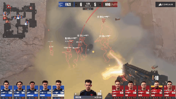 FaZe选择CT开。上半场手枪局,NRG骗B进攻A小。jcobbb双杀立功,同时b区回防的karrigan也借助闪光弹击杀警家的daps,FaZe率先拿下前两分。第3回合,NRG最后30秒从A小进攻,配合A大的daps成功清空包点放手CT。 第四回合,FaZe三人前压中路,掉人的NRG反应迅速进攻B区,karrigan单人守点失败后FaZe放弃回防。第6回合,NRG在中路遭FaZe反清,两中门加两A小的站位,将T方展开的计划直接掐碎。 第七回合,FaZe使出双狙防守,jcobbb再次双杀立功,NRG直接选择保枪。 第9回合,jcobbb不讲理混死NRG的A大两人,NRG继续静音接触A大,趁对手不备抢占包点下包,XotiC大狙尽力连收两人最终被补枪。 比分来到6-4,双方B区2换2后NRG进点下包,daps跳警家成功绕后回防队员再得一分。第12回合,NRG精准找到单挂B区的frozen,同时钻出展开烟又自己炸开B门烟成功击杀烟后的broky,XotiC在B通陆续接住从B1回防的3名CT,上半场比分定格在6-6。