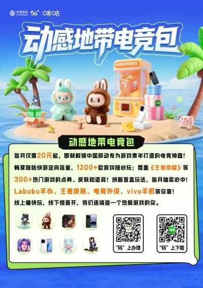 每月仅需20元起,即刻解锁中国移动专为游戏青年打造的电竞神器!畅享咪咕快游定向流量,1200+款游戏随心玩;覆盖《王者荣耀》等300+热门游戏的点券、皮肤和道具!创新盲盒玩法,每月抽奖必中——Labubu手办、王者皮肤、电竞外设、vivo手机等你拿!办理电竞包参加比赛的同学更可以享受双倍奖金权益!