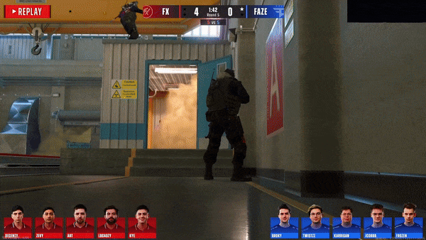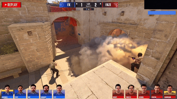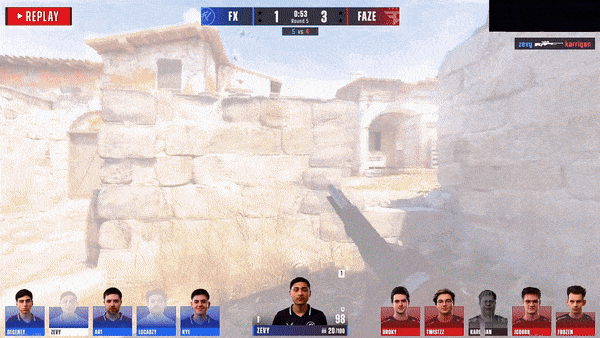 FaZe先做进攻方。手枪局,土匪拱门夹A,人数互换放下雷包后二打二土匪选择扑警家保一边,最后虽然kye三杀把人杀完但没时间拆包,手枪局Fluxo拿下。